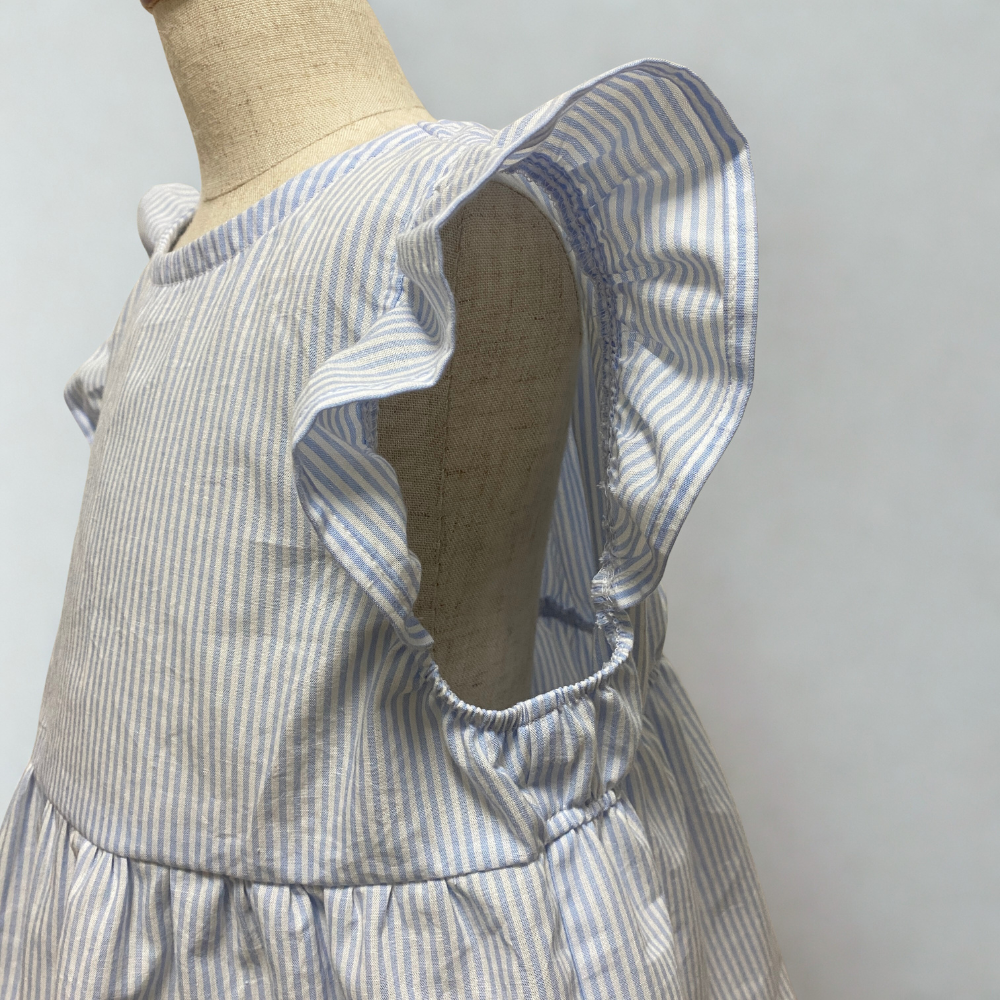 肩フリルのボリューム感や衿ぐりゴムのフィット感、袖ぐりのパイピングの仕上がりまで、何度も微調整を重ねています。