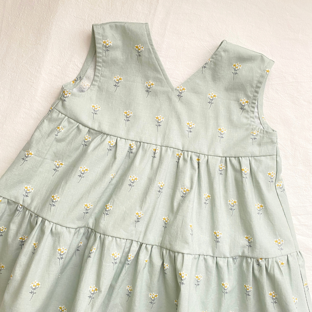 ふんわり広がるティアードと、後ろ姿が印象的なVあきデザイン。